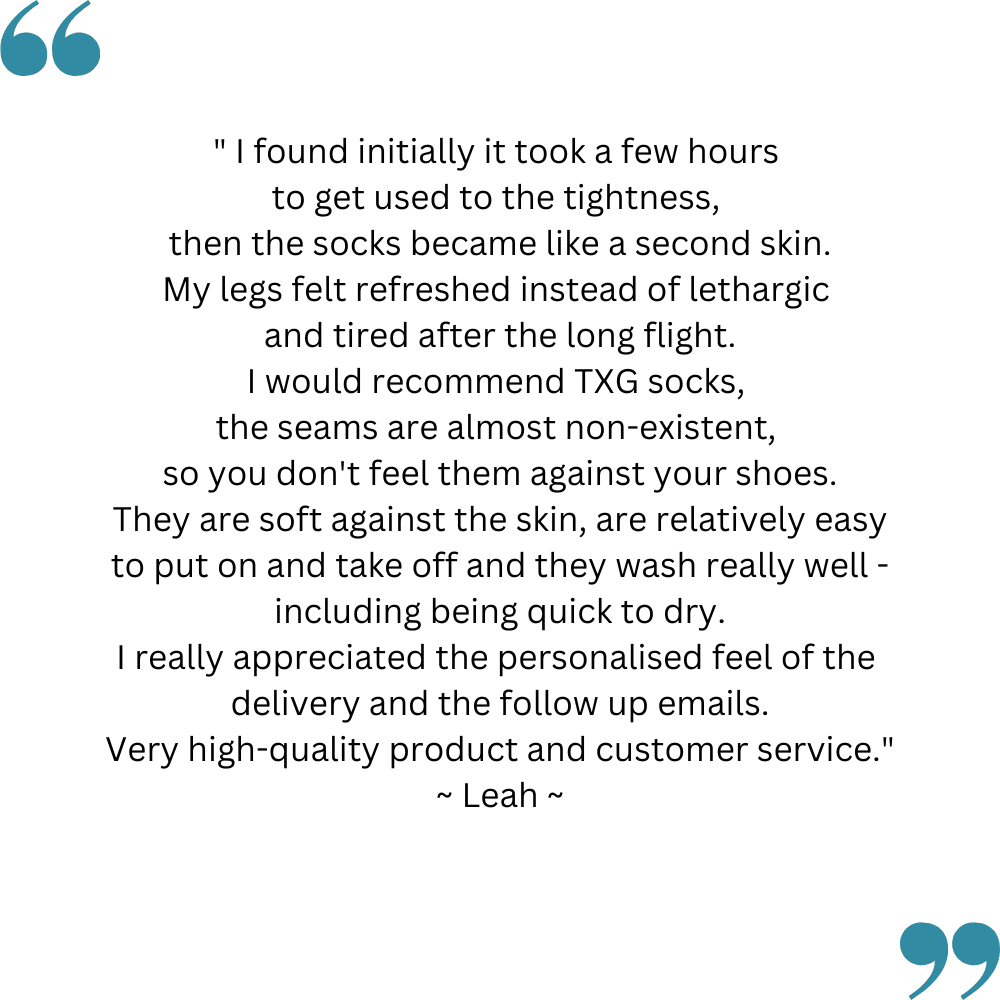 Dear Heather, I'm not aware that I have any medical condition that necessitates wearing compression stockings on extended flights, but do know that the evidence for their efficacy is well researched and proven. I purchased a pair from you on 26 April 24 and could not be more impressed with the product and standard of service from TXG. Outstanding from order; to opening the package after delivery, to info from TXG with useful hints for putting the stockings on and for 'bedding them in' before my first flight, and now to having worn them on four different 24 hour flights door to door AND the ultimate test - for all four flights, finding the stockings to be without smell when taking them off. Congratulations and thank you. Unsurprisingly, I am recommending TXG to family and friends.